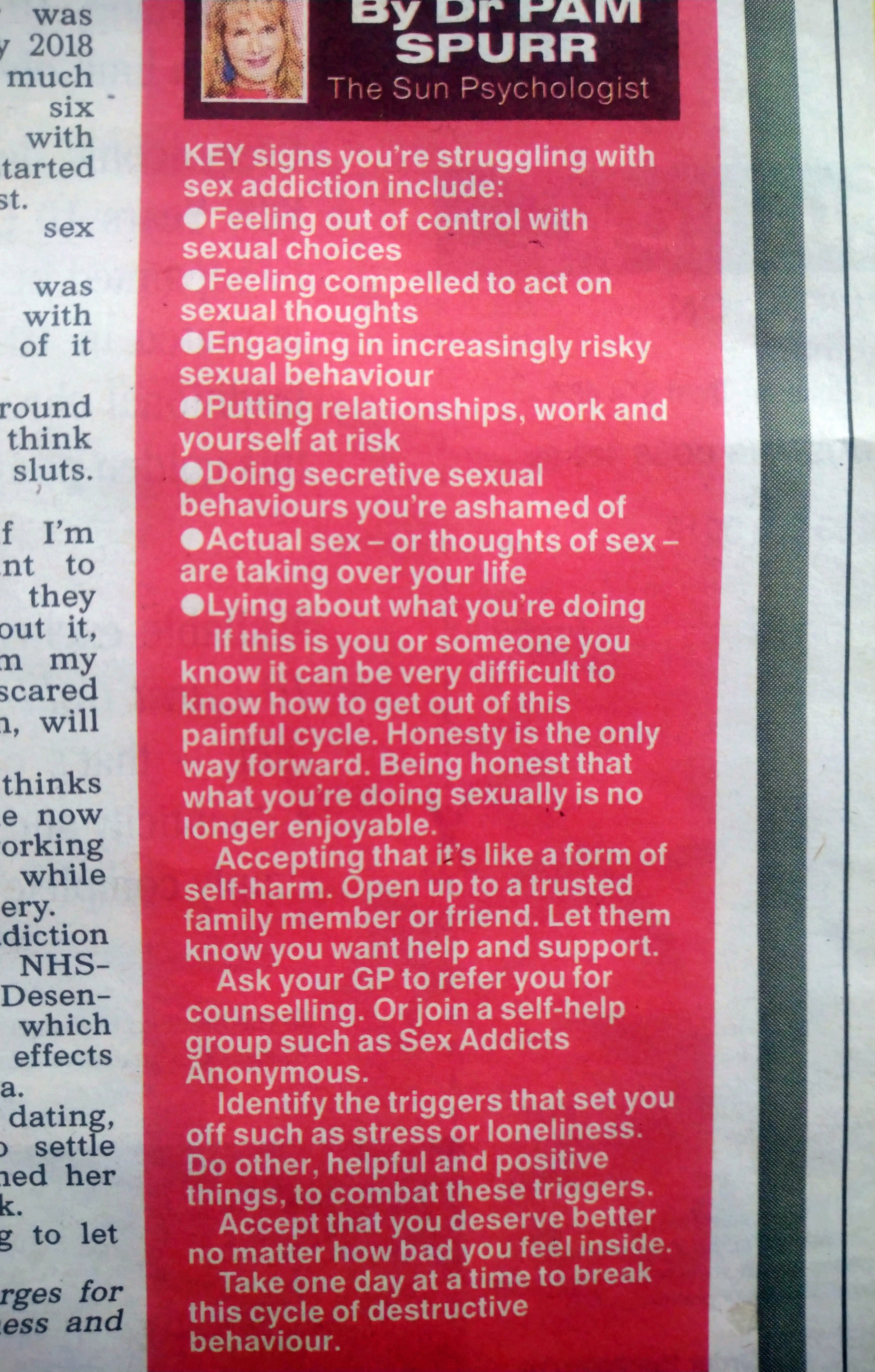 In today's Sun newspaper I've written about some key signs that you might be struggling with sex addiction - and if so, how to start sorting it out.